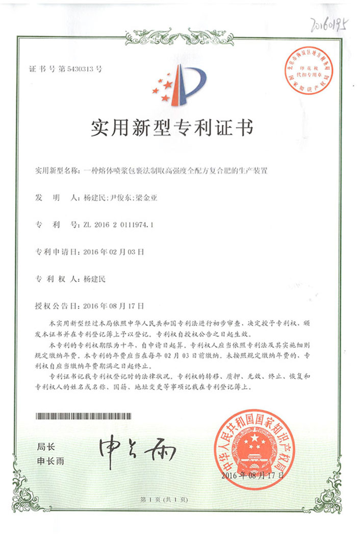 熱烈祝賀我公司又取得一項(xiàng)專(zhuān)利《一種熔體噴漿包裹法制取高強(qiáng)度全配方復(fù)合肥的生產(chǎn)裝置》