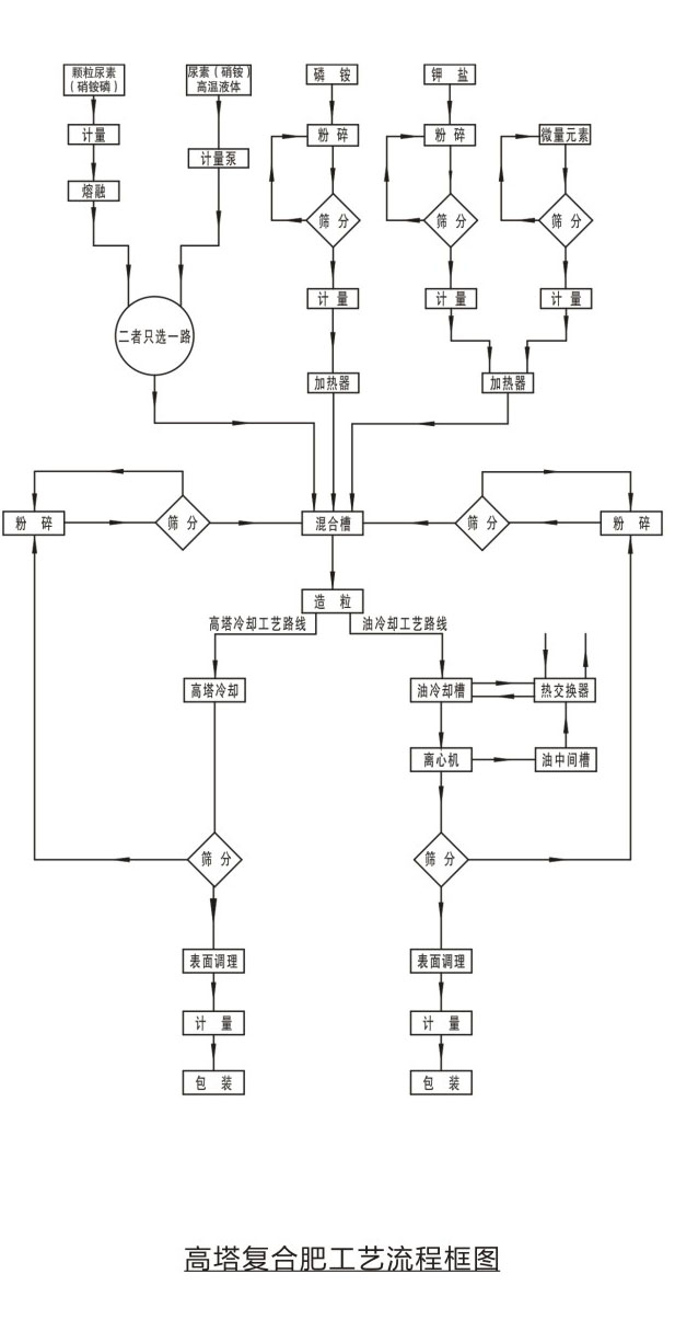 工藝原理固體尿素或硝銨(硝銨磷等)通過熔融器加熱熔融后成為熔融液,也可以直接使用蒸發(fā)濃縮后的液態(tài)尿液(硝銨)液中加入相應(yīng)的磷肥、鉀肥、填料及添加劑制成 混合料漿。混合料漿進(jìn)入高塔造粒設(shè)備進(jìn)行噴灑造粒,物料在從高塔下降過程中,與塔底上升氣流阻力相互作用,與其進(jìn)行熱交換后降落到塔底,落入塔底的物料,經(jīng)篩分表面處理后得到顆粒復(fù)合肥。
